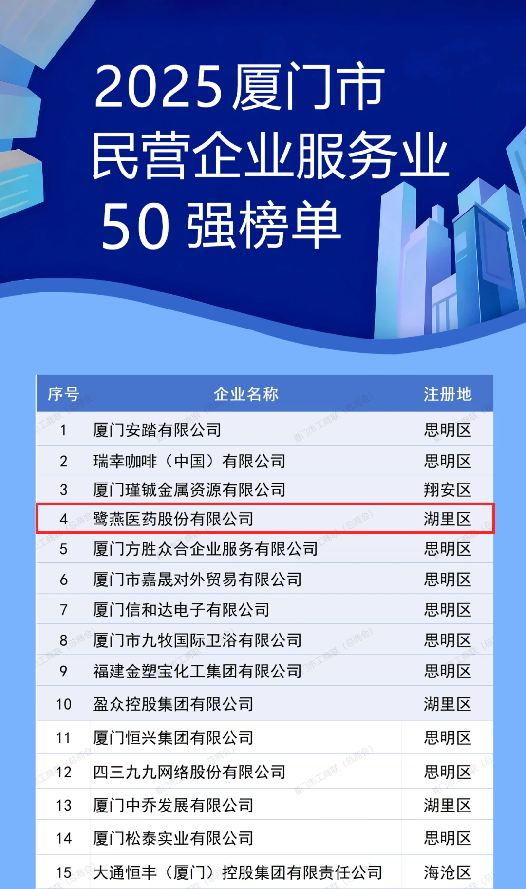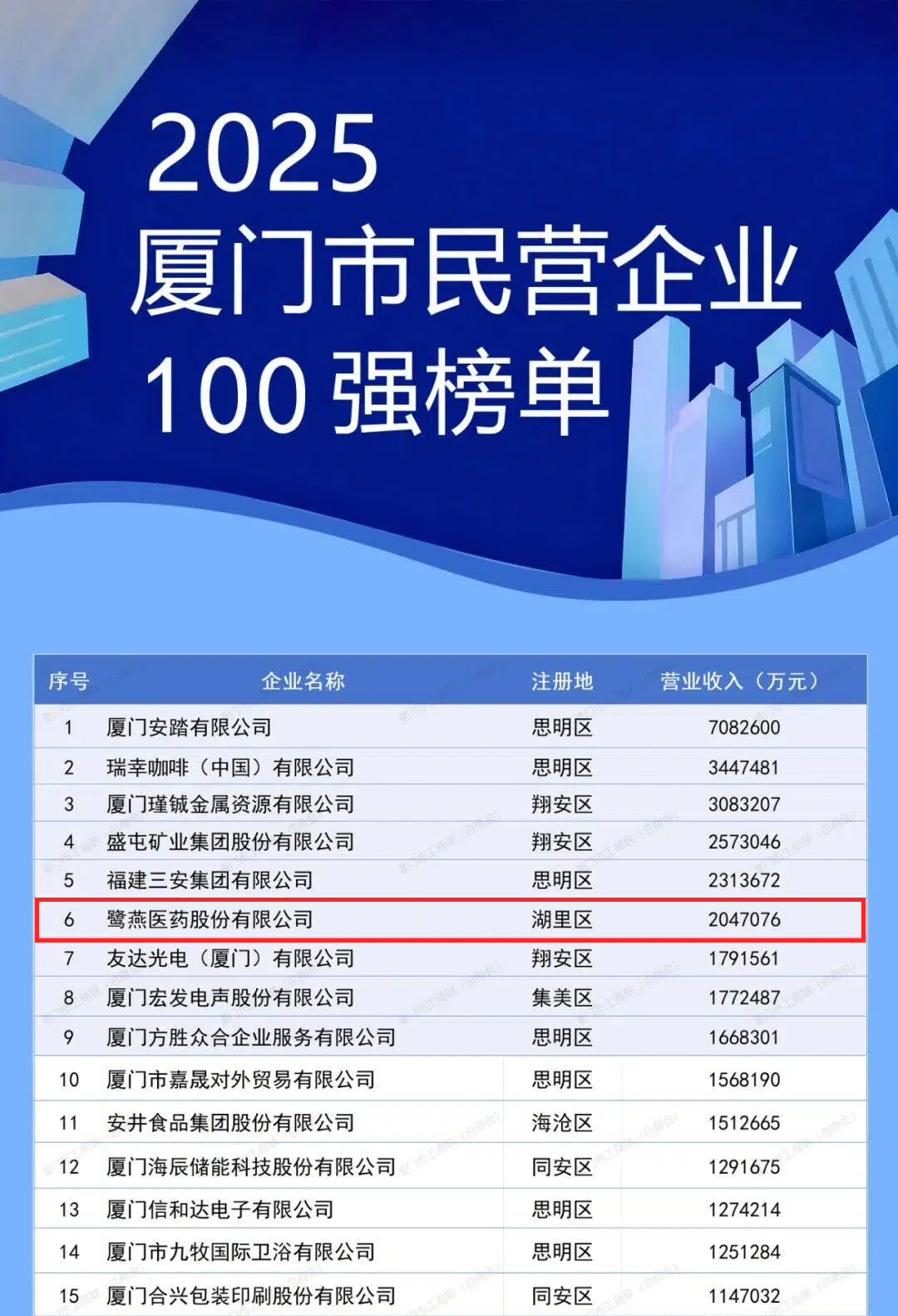 11月1日上午,2025年廈門(mén)企業(yè)家日大會(huì )召開(kāi)。大會(huì )發(fā)布了2025廈門(mén)市民營(yíng)企業(yè)100強系列榜單,介紹了廈門(mén)市民營(yíng)經(jīng)濟發(fā)展態(tài)勢和營(yíng)商環(huán)境建設成效。鷺燕醫藥股份有限公司憑借上市企業(yè)綜合實(shí)力,榮膺“2025廈門(mén)市民營(yíng)企業(yè)100強”第6位,以及“2025廈門(mén)市民營(yíng)企業(yè)服務(wù)業(yè)50強”第4位。